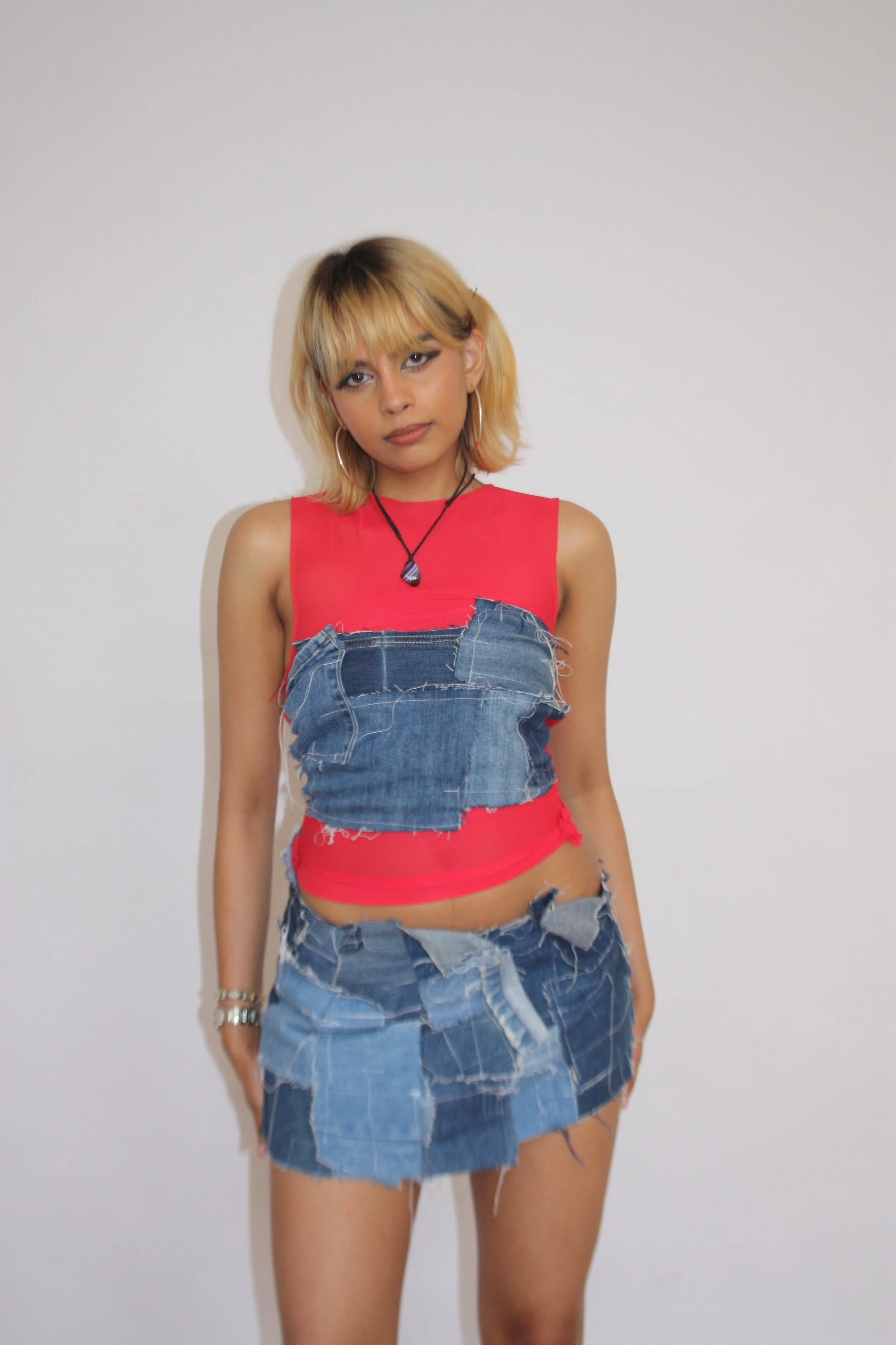 Made with recycled denim and handpicked mesh, this fitted top is a unique piece to join a tailored collection.
